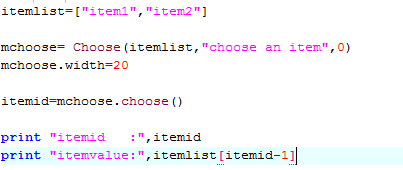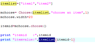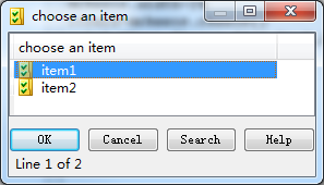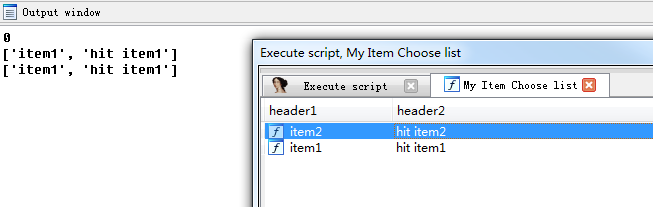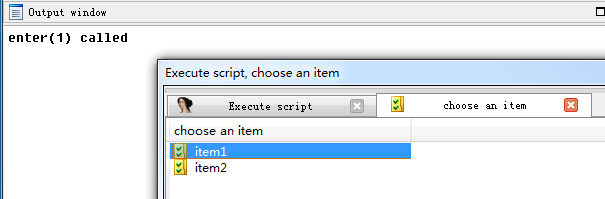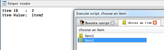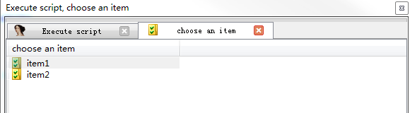 在最上层窗口新建一个tab标签,并展示该选择框,这种选择框会一直存在直到用户主动关闭。当用户进行选择时,输出窗口会以默认格式输出选择结果: